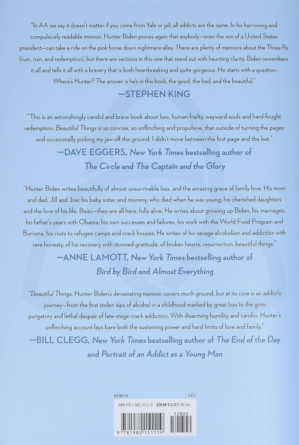 Yeah, Stephen King knows about children in mortal danger. Not that King cares. From the back cover of Hunter Biden’s “Beautiful Things: A Memoir”, note the very first endorsement: